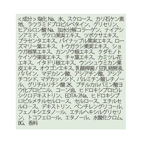塩化Na、水、スクロース、カリ石ケン素地、ラウラミドプロピルベタイン、グリセリン、香料、ヒドロキシプロピルシクロデキストリン、EDTA-2Na、ヒドロキシプロピルメチルセルロース、セルロース、ブチルカルバミン酸ヨウ化プロピニル、エチルセルロース、BG、グリチルリチン酸2K、ナイアシンアミド、加水分解コラーゲン、デキストリン、パルミチン酸レチノール、コーン油、エタノール、パパイン、ザクロ果実エキス、ツボクサエキス、ペンチレングリコール、イタドリ根エキス、ウンシュウミカン果皮エキス、オウゴンエキス、パイナップル果実エキス、乳酸桿菌/豆乳発酵液、ショウガ根茎エキス、カンゾウ根エキス、クダモノトケイソウ果実エキス、チャ葉エキス、ヒアルロン酸Na、フェノキシエタノール、アシアチコシド、アシアチン酸、カミツレ花エキス、トコフェロール、マデカシン酸、マデカッソシド、ローズマリー葉エキス、プラセンタエキス、エチルヘキシルグリセリン、トウガラシ果実エキス、水酸化クロム