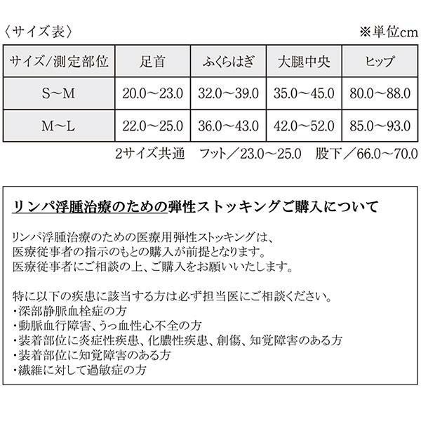 S-M:足首20~23cm、ふくらはぎ32~39cm、大腿中央35~45cm、ヒップ80~88cm、股下66~70cm、フット23~25cm