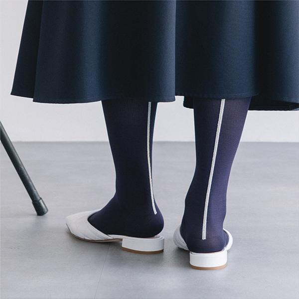 バックスタイルに映える1本のラインが、ファッションにアクセントを与えながら、縦ラインで脚をまっすぐに長く魅せてくれる効果も。