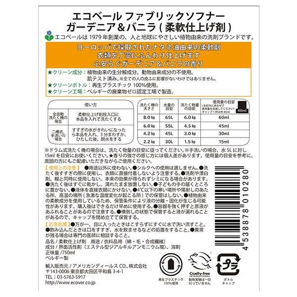 エコベール ファブリックソフナーガーデニア&バニラ 750ml×4個セット 柔軟剤 クリーン成分 丁寧 正規品 ギフト可