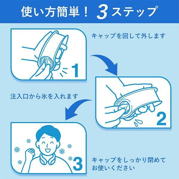 注入口のキャップを回して外し、注入口に氷と少量の水を入れキャップをしっかりと閉めて首にかけるだけ。