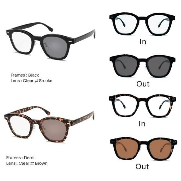 調光レンズを採用しており、屋内ではクリアな印象に、屋外では紫外線を受けて自然にスモークへと変化。1本で眼鏡とサングラスの2役を果たし、日常使いから外出先まで幅広く活躍します。
