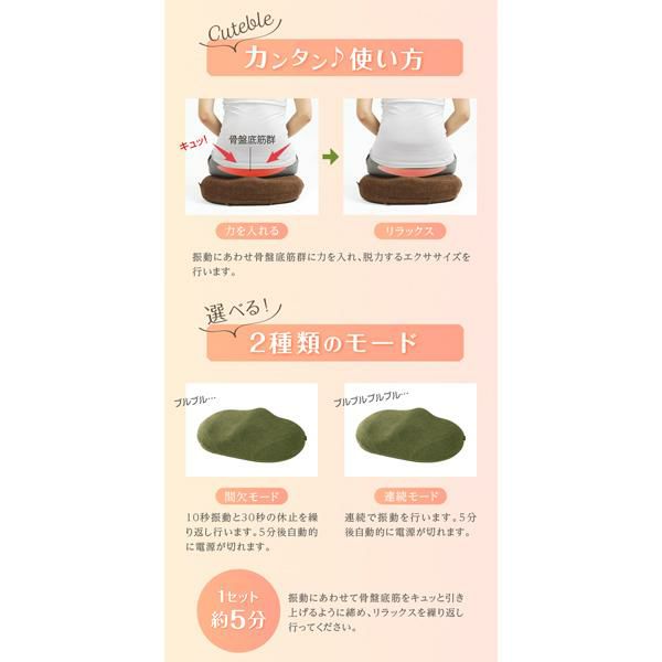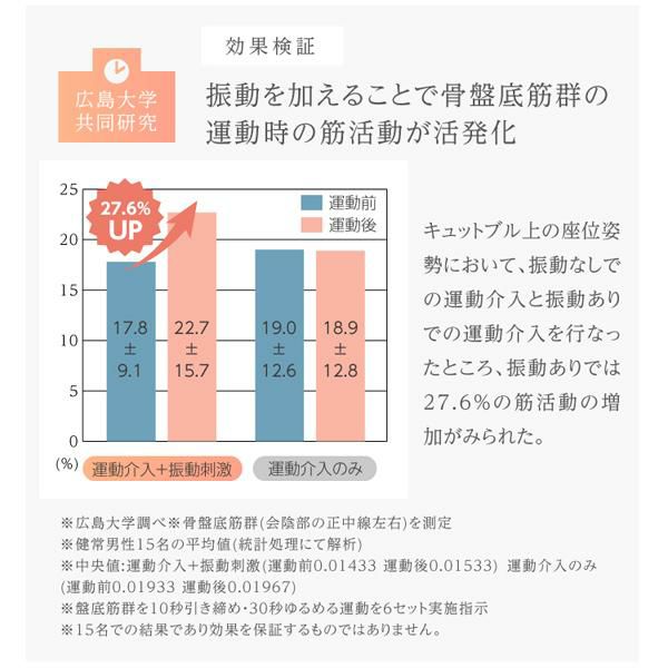振動に合わせて尿道周りの筋肉を引き上げるように力を入れるエクササイズを行うことで、骨盤底筋群に効果的なエクササイズが可能になります。