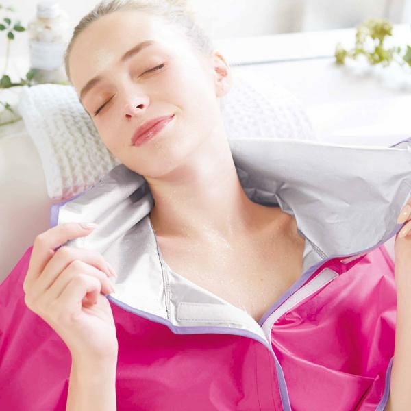 お手持ちの乾いたタオルを両肩にかけ、その上からポンチョを着用してください。吹き出る汗をタオルが吸収し、こもった熱気はポンチョが逃さないので快適な半身浴が体感できます。