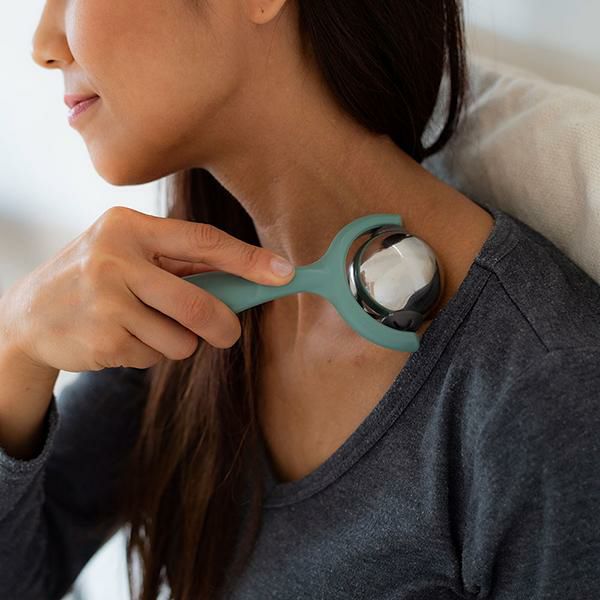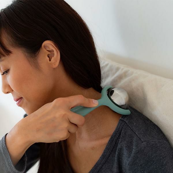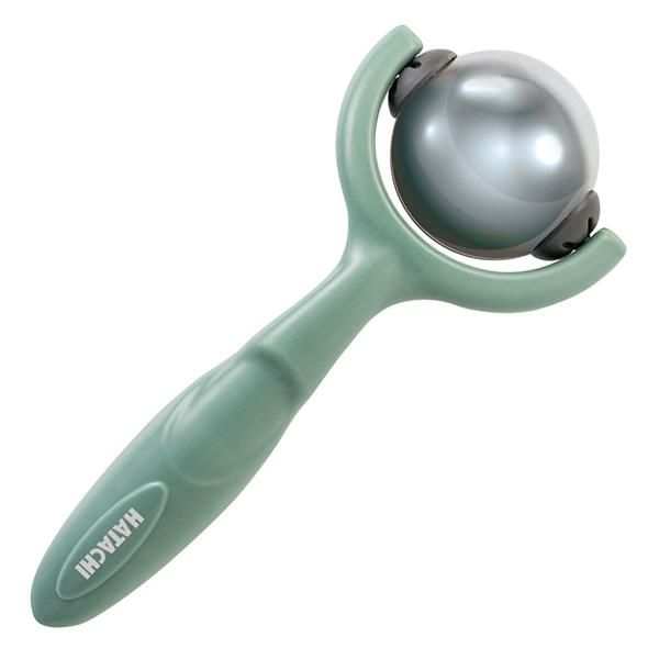 持ち手つきで転がしやすい、電気を使わない、冷温機能2wayの使い方。保温を手助けするジェル内蔵ステンレス製ボールのスティック付きボールローラー。