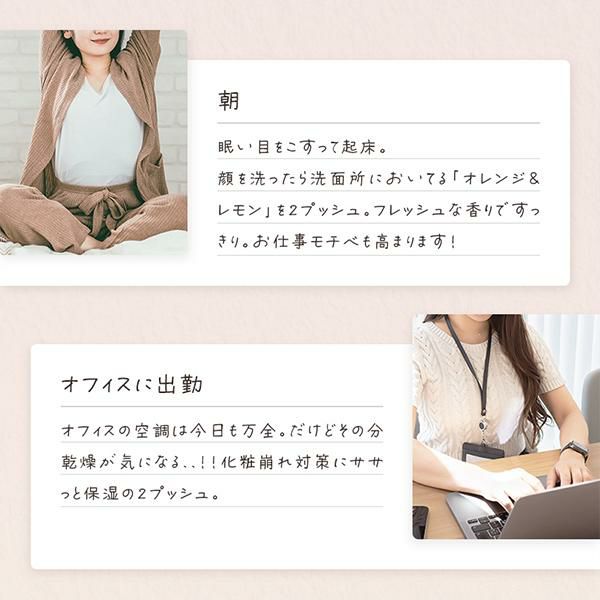 気分に合わせてシュッとひと吹き、精油の贅沢な香りで、自分をいたわる特別なひとときを。