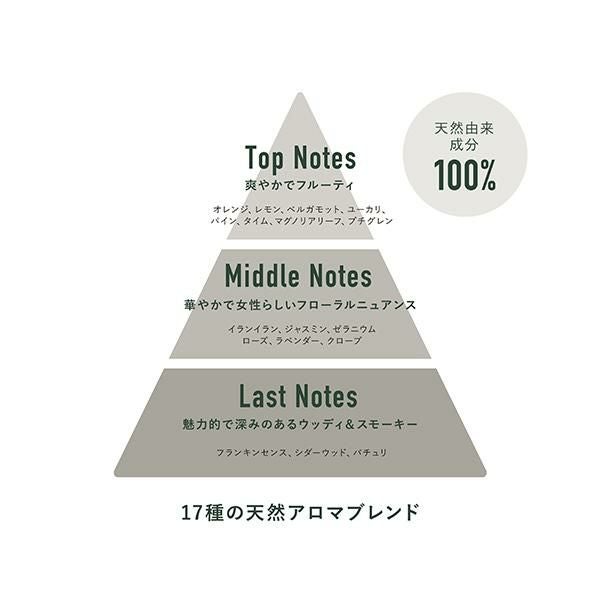 17種の天然アロマをブレンドした、大人のスパイシーさを併せ持った深みのある贅沢な香りで、トップノートからミドル、ラストへと幸福感あふれる香りの変化を楽しめます。植物元来の力をぎゅっと濃縮した精油は、香りだけにとどまらず様々な用途で用いられ、リラックスやリフレッシュなど心身のケアに役立つと言われています。