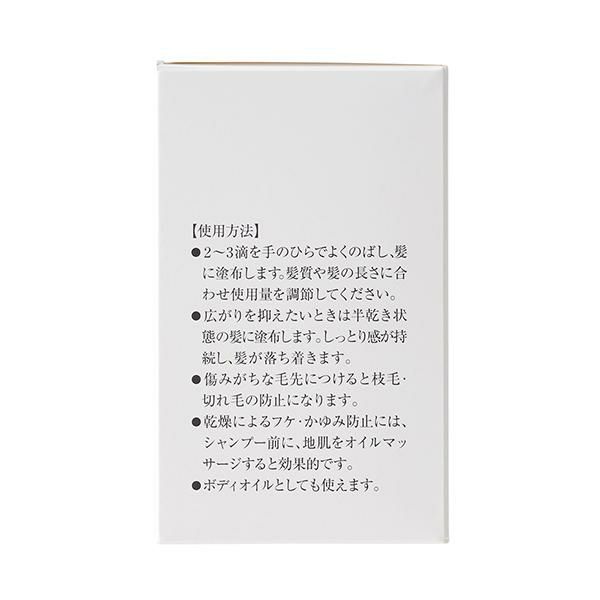 さざんか油とホホバ油、ヒマワリ油を組み合わせた植物オイル100%のヘアオイルです。パサつきを抑え、しっとりと落ち着く髪に整えます。