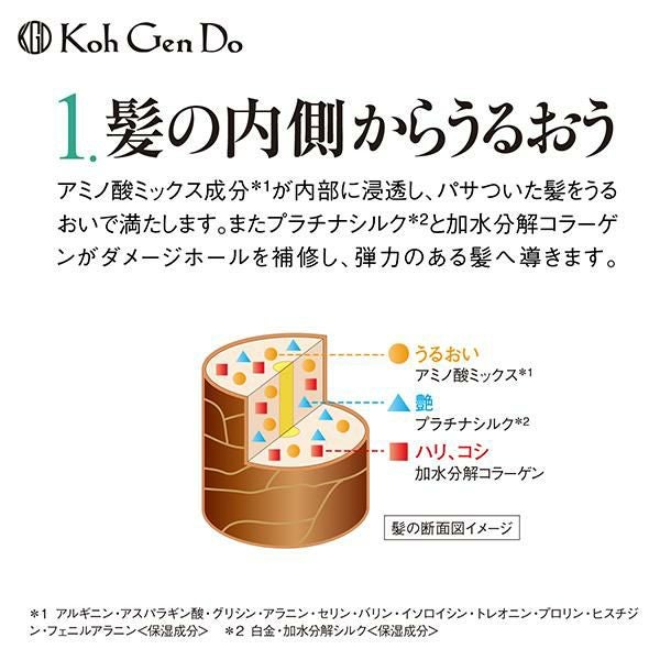 ダメージを受けた髪を、内と外の両面からアプローチする、スキンケア発想から生まれた、リペアトリートメント。髪の内部に浸透するプラチナシルク※を配合し、植物由来の成分がドライヤーの熱に反応して髪を守り、ケアしながら、1本1本をコーティング。しなやかでコシのある艶髪へと補修します。天然精油のやさしい香りとともに、指通りのよい仕上がりに。
