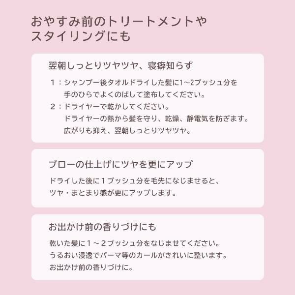 ■オーガニック抽出エキス(ローズマリーエキス、カミツレエキス、セージエキス、ノバラエキス)上質なホワイトフラワーの香り。ヘアオイルは特に傷んだ髪にオススメ。ベタつかないでしっとりとする使用感。