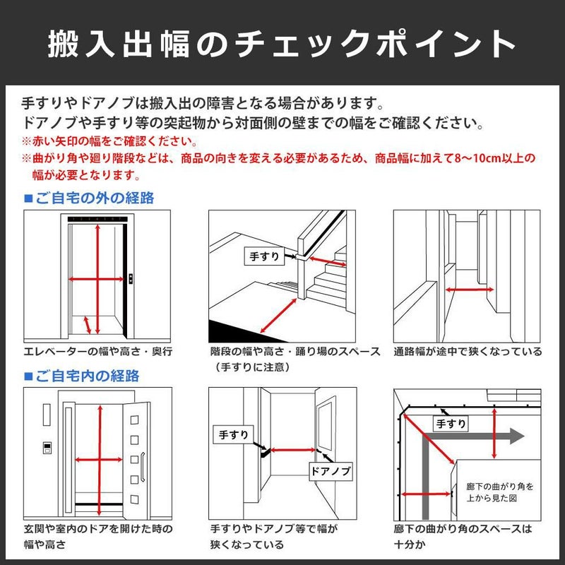 搬入時、家具や、壁を傷つけないためにも、+5cm以上は余裕をもって通路幅の測定をお願いいたします。