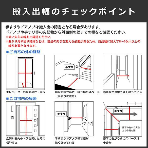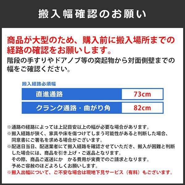 ※上記幅は目安となります。搬入時、家具や、壁を傷つけないためにも、+5cm以上は余裕をもって通路幅の測定をお願いいたします。
