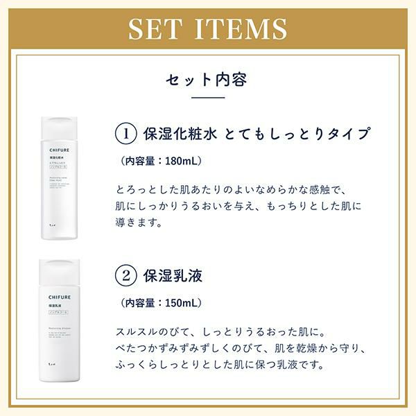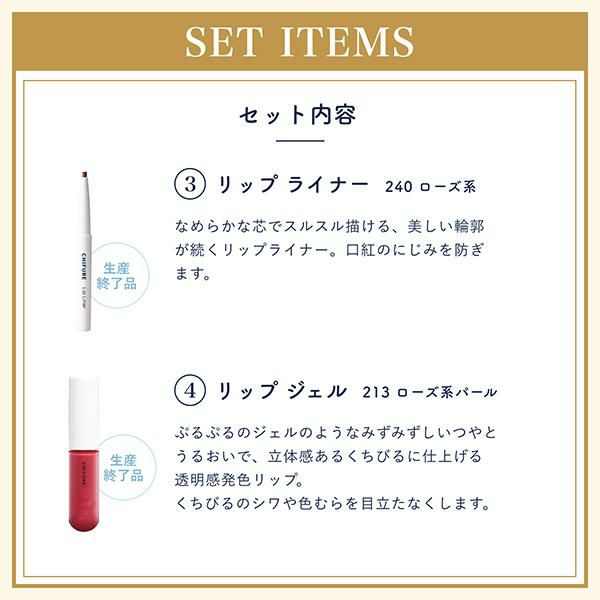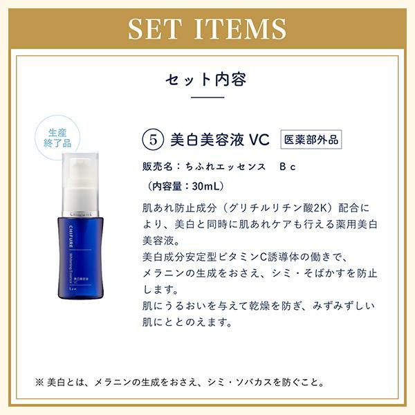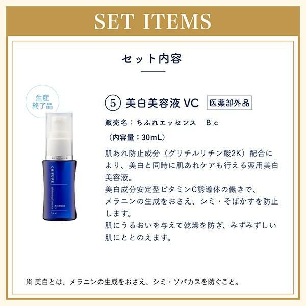 保湿化粧水 とてもしっとりタイプ/保湿乳液/【医薬部外品】美白美容液 VC(販売名:ちふれ エッセンス Bc)/リップ ライナー N 240/リップ ジェル N 213の計5点が入ったお得なメイク・スキンケアセットです。