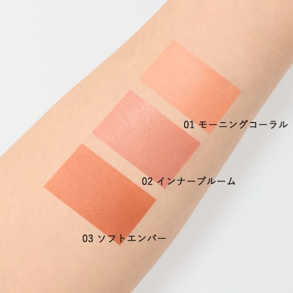 ・モーニングコーラル:やわらかな光を宿すフレッシュコーラル。 血色感を与えつつ、肌トーンを整えます。肌に溶け込むライトカラーでクマのカバーにも。