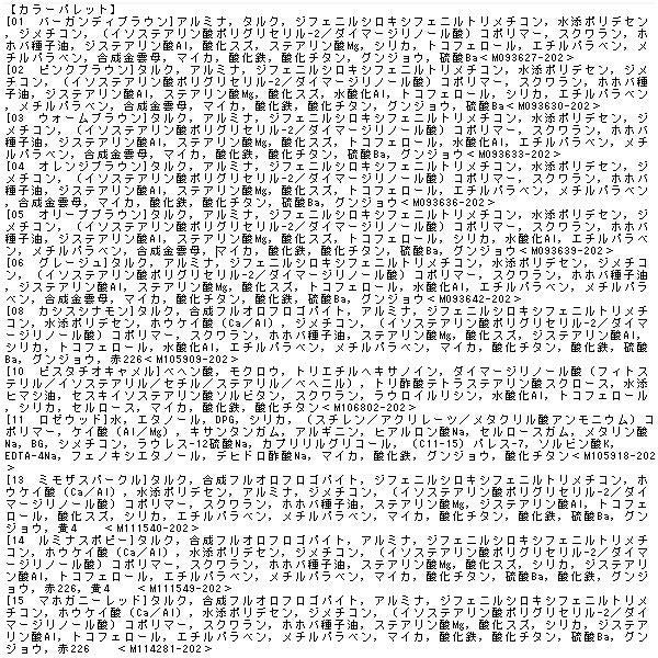 [01 バーガンディブラウン]アルミナ,タルク,ジフェニルシロキシフェニルトリメチコン,水添ポリデセン,ジメチコン,(イソステアリン酸ポリグリセリル-2/ダイマージリノール酸)コポリマー,スクワラン,ホホバ種子油,ジステアリン酸Al,酸化スズ,ステアリン酸Mg,シリカ,トコフェロール,エチルパラベン,メチルパラベン,合成金雲母,マイカ,酸化鉄,酸化チタン,グンジョウ,硫酸Ba<M093627-202>