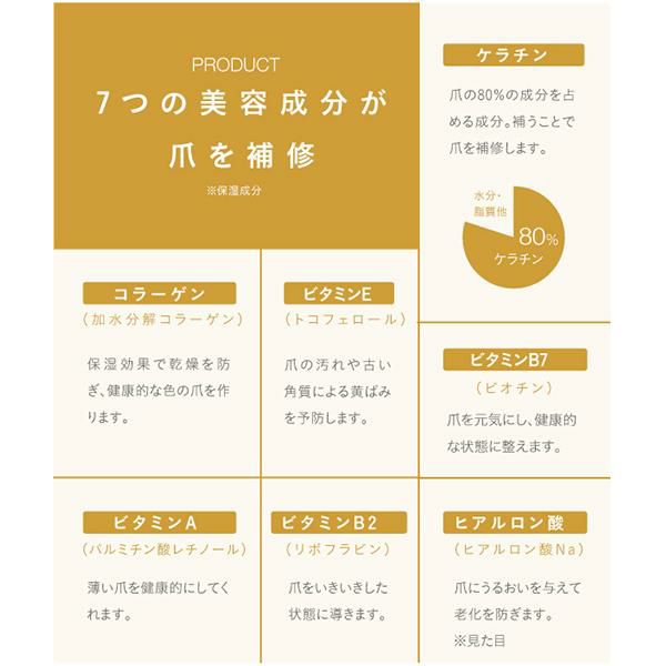 爪の成分に近しい美容成分を配合し、ダメージがあったり、老けた爪を潤い補修しながら、見た目にも美しい爪に仕上げます(コーティング効果)。