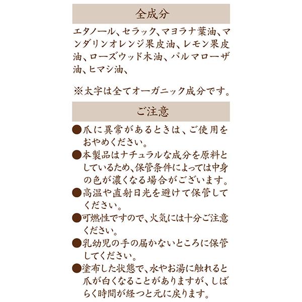 柔軟性にすぐれた天然樹脂(セラック)でコーティングして、二枚爪やダメージを受けやすい薄爪を守ります。除光液いらずで爪にやさしく、つややかに保ちます。自爪に自然なツヤを与え、健康的で美しい指先へ。ローズウッド木油・パルマローザ油・マンダリンオレンジ果皮油・マヨラナ葉油・レモン果皮油(全て爪保護成分)配合。爽やかでシャープなマジョラムの香り。