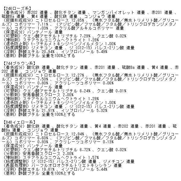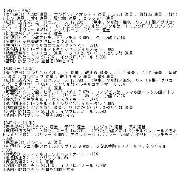 (皮膜形成成分)ニトロセルロース 12.48% 、(無水フタル酸/無水トリメリト酸/グリコールズ)コポリマー 8.58% 、アクリル酸アルキルコポリマー 1.28% 、(アジピン酸/フマル酸/フタル酸/トリシクロデカンジメタノール)コポリマー 0.35%