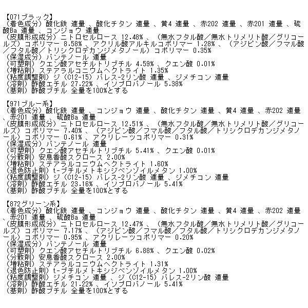 (皮膜形成成分)ニトロセルロース 12.92% 、(無水フタル酸/無水トリメリト酸/グリコールズ)コポリマー 6.99% 、(アジピン酸/フマル酸/フタル酸/トリシクロデカンジメタノール)コポリマー 1.16% 、アクリル酸アルキルコポリマー 適量