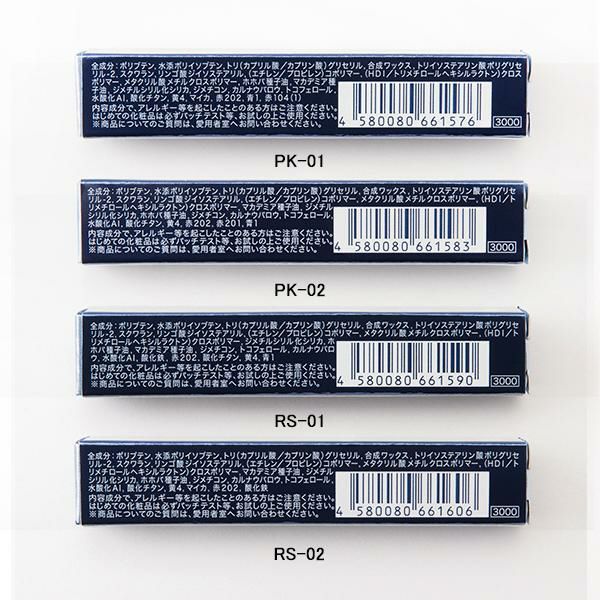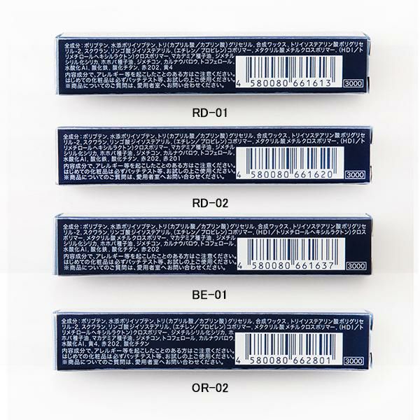 ポリブテン、水添ポリイソブテン、トリ(カプリル酸/カプリン酸)グリセリル、合成ワックス、トリイソステアリン酸ポリグリセリル-2、スクワラン、リンゴ酸ジイソステアリル、(エチレン/プロピレン)コポリマー、メタクリル酸メチルクロスポリマー、(HDI/トリメチロールヘキシルラクトン)クロスポリマー、マカデミア種子油、ジメチルシリル化シリカ、ホホバ種子油、ジメチコン、カルナウバロウ、トコフェロール、水酸化Al、酸化チタン、黄4、赤202、赤201、青1