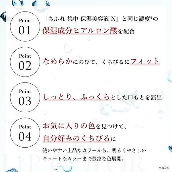 ●【美容液と同じ保湿成分配合】保湿成分ヒアルロン酸を、ちふれ集中保湿美容液Nと同じ濃度(0.2%)で配合した口紅です。