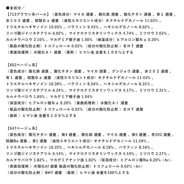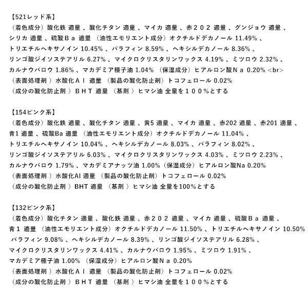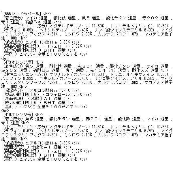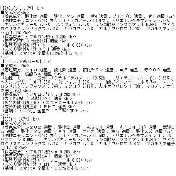 (着色成分)酸化鉄 適量, 青1 適量, 赤202 適量, 酸化鉄チタン 適量, 赤104(1)適量, 赤201 適量, マイカ 適量, 硫酸Ba 適量, 酸化スズ 適量