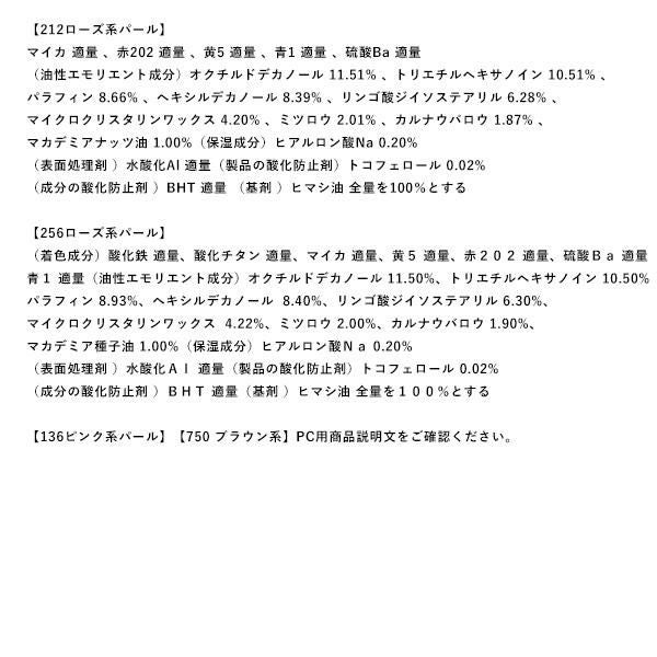 (着色成分)マイカ 適量、酸化チタン 適量、酸化鉄 適量、黄5 適量、赤202 適量、硫酸Ba 適量、シリカ 適量、青1 適量
