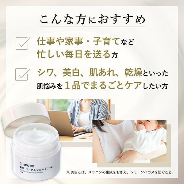 他の画像を見る 【12/13から!10%クーポン】ちふれ 薬用 リンクルジェルクリーム シワ改善 シミ予防 肌あれ 保湿 化粧水 美容液 乳液 クリーム マスク アイクリーム ネッククリーム chifure 医薬部外品 正規品 ギフト可 日付指定可 10%OFF セール価格 ¥ 3,080 税込 カートに入れる お気に入りに登録する