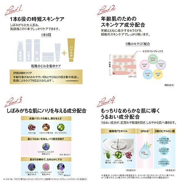 うるおいを補う5種のセラミドや、しぼみがちな大人肌をハリ感のある肌へ導くハリ艶サポート成分を贅沢に配合。
