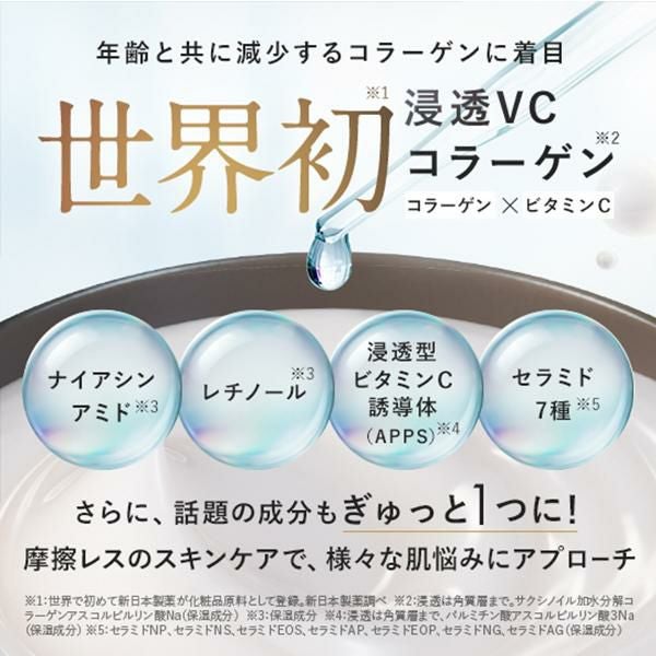 肌のゆるみ※1が気になる方に。世界初※2の独自成分「浸透VCコラーゲン※3」を含む最高濃度のコラーゲンで※4で、引き締まったハリ肌へ導きます。 さらに、ナイアシンアミド※5・レチノール※5など話題の成分もたっぷり配合。