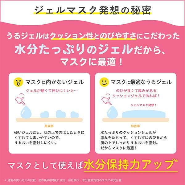 ●【水分たっぷりジェルマスク発想】うるジェルは “クッション性” と “のびやすさ“ にこだわった ”水分たっぷりジェル”でしっかりうるおいを密封するから、マスクとして使用するのがおすすめ!べたつかず、もっちりとした使用感で、不快感なくマスク使いが可能です。