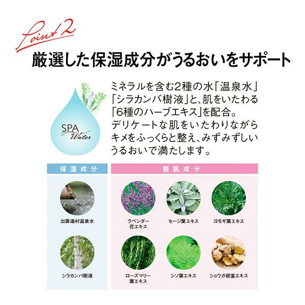 水、グリセリン、BG、ペンチレングリコール、温泉水、シラカンバ樹液、ラベンダー花エキス、ローズマリー葉エキス、セージ葉エキス、シソ葉エキス、ヨモギ葉エキス、ショウガ根茎エキス、加水分解ヒアルロン酸、ヒアルロン酸ヒドロキシプロピルトリモニウム、エラグ酸、アセチルヒアルロン酸Na、オリーブグリセリズ、ホホバ種子油、シア脂、スクワラン、シソ種子油、オリーブ果実油、カルボキシメチルヒアルロン酸Na、ヒアルロン酸クロスポリマーNa、グリコシルトレハロース、グリセリルグルコシド、グリチルリチン酸2K、アルギニン、イソステアリン酸イソブチル、カルボマー、ココイル(アジピン酸/トリメチロールプロパン)コポリマー、ジグリセリン、フィトステロールズ、ダイマージリノール酸(フィトステリル/イソステアリル/セチル/ステアリル/ベヘニル)、トリイソステアリン、加水分解水添デンプン、水添レシチン、フェノキシエタノール