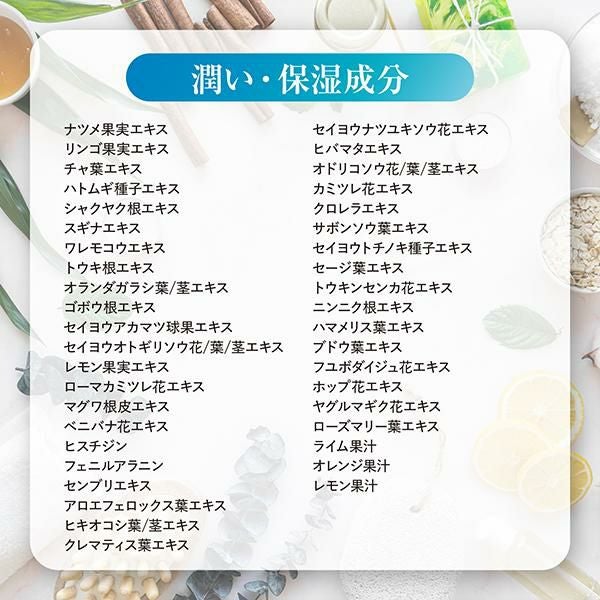 水、グリセリン、DPG、ペンチレングリコール、イソステアリン酸イソステアリル、アルギニン、カルボマー、アルギン酸Na、グリチルリチン酸2K、ノバラ油、BG、アスコルビン酸硫酸2Na、アボカド油、ゴマ油、ハチミツ、ヒアルロン酸Na、海塩、デキストリン、エタノール、水添レシチン、ビフィズス菌培養溶解質、黒砂糖エキス、プラセンタエキス、スクワラン、オリーブ果実油、ダイズステロール、パパイン、ホホバ種子油、マカデミア種子油、PCA-Na、乳酸Na、セラミド3、セラミド2、セラミド6II、アスパラギン酸、PCA、セイヨウキズタ葉/茎エキス、グリシン、カワラヨモギ花エキス、キハダ樹皮エキス、アラニン、アルニカ花エキス、カニナバラ果実油、キュウリ果実エキス、コメヌカスフィンゴ糖脂質、セイヨウニワトコ花エキス、ゼニアオイ花エキス、パリエタリアエキス、オウゴン根エキス、セリン、アロエベラ葉エキス、バリン、アセチルチロシン、ローヤルゼリーエキス、ノイバラ果実エキス、クズ根エキス、オタネニンジン根エキス、イソロイシン、ダイズ種子エキス、トレオニン、プロリン、ボタンエキス、クララ根エキス、グレープフルーツ果実エキス、サンザシエキス、ナツメ果実エキス、リンゴ果実エキス、サクシノイルアテロコラーゲン、チャ葉エキス、ハトムギ種子エキス、水溶性コラーゲン、シャクヤク根エキス、スギナエキス、ワレモコウエキス、トウキ根エキス、オランダガラシ葉/茎エキス、ゴボウ根エキス、セイヨウアカマツ球果エキス、セイヨウオトギリソウ花/葉/茎エキス、レモン果実エキス、ローマカミツレ花エキス、マグワ根皮エキス、ベニバナ花エキス、ヒスチジン、フェニルアラニン、センブリエキス、アロエフェロックス葉エキス、ヒキオコシ葉/茎エキス、クレマティス葉エキス、セイヨウナツユキソウ花エキス、ヒバマタエキス、オドリコソウ花/葉/茎エキス、カミツレ花エキス、クロレラエキス、サボンソウ葉エキス、セイヨウトチノキ種子エキス、セージ葉エキス、トウキンセンカ花エキス、ニンニク根エキス、ハマメリス葉エキス、ブドウ葉エキス、フユボダイジュ花エキス、ホップ花エキス、ヤグルマギク花エキス、リゾレシチン、ローズマリー葉エキス、ライム果汁、オレンジ果汁、レモン果汁、フェノキシエタノール