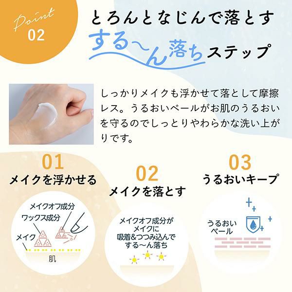 ●【洗浄力と保湿感を両立】うるおいを守りながら、肌に負担をかけずによごれもメイクもしっかり落とす、「する~ん落ちステップ」が特長。クレンジングバームを崩しながら肌になじませると、メイクオフ成分がメイクに吸着・つつみ込んでメイクを浮かせ、水またはぬるま湯で洗い流せばメイクよごれを「する~ん」と落とします。ワックス成分が肌をうるおいのベールで覆い、洗い上がりの肌にうるおいをキープ。乾燥を防いで、しっとりやわらかな洗い上がりです。