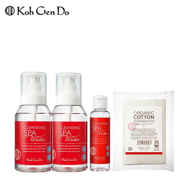 温泉水*1とハーブエキスのうるおいブレンド「SPA水*2」配合のクレンジングウォーター ポンプヘッドタイプが2本に、80mLサイズのミニボトルとコットン10枚が付いてくる特別セット。クレンジングウォーターは、コットンに含ませて軽く拭き取るだけでウォータープルーフのポイントメイクも素早く落とせ、ベタつきや皮膜感を肌に残さず、みずみずしくフレッシュな素肌へ。W洗顔・洗い流しは不要。ミネラル豊富な温泉水*1を含む「SPA水*2」で、拭き取り後はもっちりうるおった肌に。オイル・アルコール不使用で、まつ毛エクステをしている方にもおすすめです。片手でプッシュするだけで、コットンに含ませることができる簡単・便利なポンプヘッドタイプ。