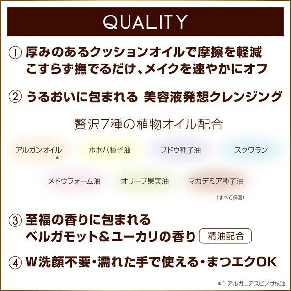 (2)うるおいに包まれる美容液発想クレンジング。贅沢7種の植物オイル配合。[アルガンオイル(アルガニアスピノサ核油)、ホホバ種子油、ブドウ種子油、スクワラン、メドウフォーム油、オリーブ果実油、マカデミア種子油(すべて保湿)]