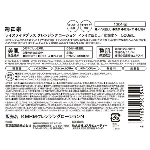 他の画像を見る 菊正宗 RiceMade+ クレンジングローションRN 500ml 米由来成分配合 うるおい 毛穴角質 透明感 素肌 洗浄 保湿 正規品 ギフト可 日付指定可 セール価格 ¥ 1,375 税込 カートに入れる お気に入りに登録する