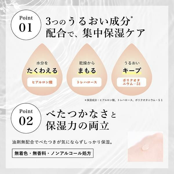 3つのうるおい成分*配合で、乾燥による肌のカサつきゴワつきに集中保湿ケア。みずみずしいもっちり肌へ。(*保湿成分:ヒアルロン酸、トレハロース、ポリクオタニウム-51)