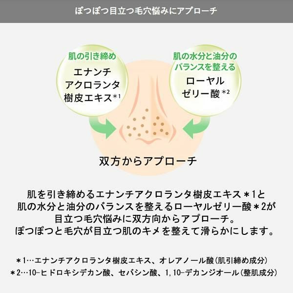 肌を引き締めるエナンチアクロランタ樹皮エキス※8と肌の水分と油分のバランスを整えるローヤルゼリー酸※9が目立つ毛穴に双方向からアプローチ。ぽつぽつと毛穴が目立つ肌のキメを整えて滑らかにします。