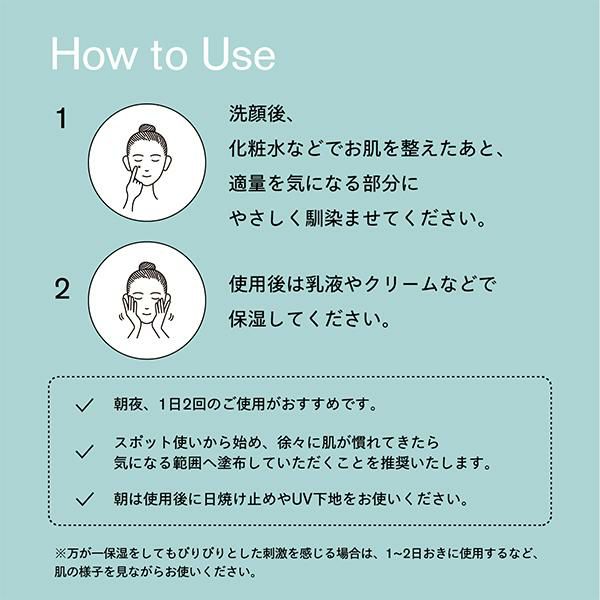 1. 朝晩の洗顔後、化粧水などでお肌を整えた後に、適量を手に取り、気になる部分に優しく馴染ませてお使いください。