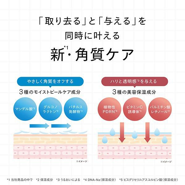 敏感肌*1でも安心して使えるやさしい角質ケア成分*2と、植物性PDRN*3、ビタミンC*4、レチノール*5といった話題のうるおい成分が角質汚れをやさしくオフして透明感*6とハリのある肌へ導きます。