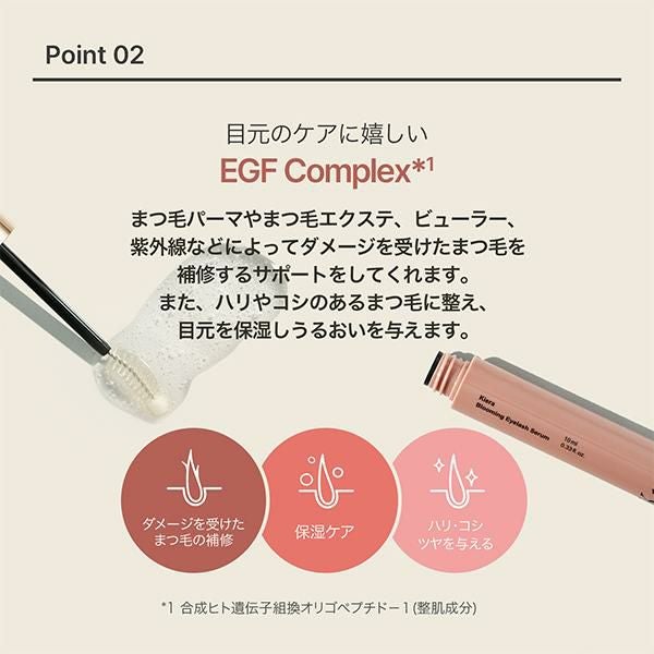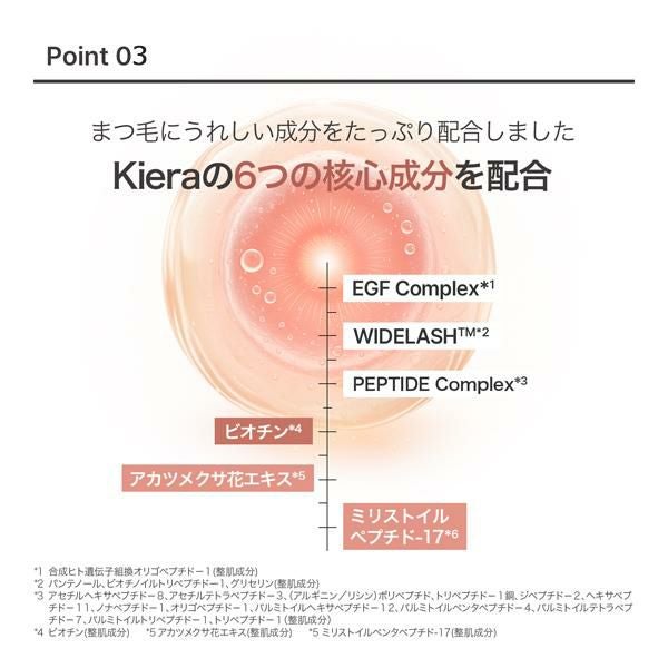 さらに、こだわり抜いた成分として Kieraの6つの核心成分**を配合し、 ハリやコシのあるまつ毛に整え魅力的な 目元の印象へ導きます。