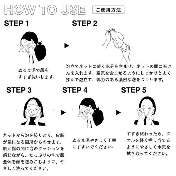 付属の泡立てネットに軽く水分を含ませ、ネットの間に石けんを入れます。空気を含ませるように泡立て、絞りとった泡で顔を包み込むようにやさしく洗います。洗顔後は十分にすすいでください。
