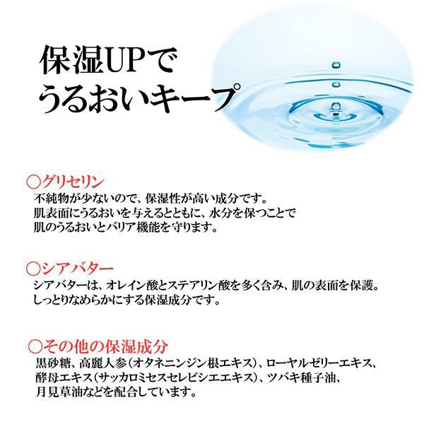 カリ石ケン素地、水、ステアリン酸、BG、スクロース、グリセリン、パーム核脂肪酸アミドDEA、火山灰、ベントナイト、黒砂糖、カンゾウ根エキス、オタネニンジン根エキス、サッカロミセスセレビシアエエキス、ローヤルゼリーエキス、オウゴン根エキス、オウレン根エキス、キハダ樹皮エキス、クチナシ果実エキス、褐藻エキス、シア脂、ツバキ種子油、月見草油、ユーカリ油、ローズマリー葉油、ベヘニルアルコール、ステアリン酸PEG-2、セテス-30、クオタニウム-73、トコフェロール