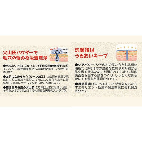 微粒子パウダーの桜島火山灰が毛穴の奥の皮脂や汚れを吸着洗浄し、シア脂、月見草油でうるおいキープ。