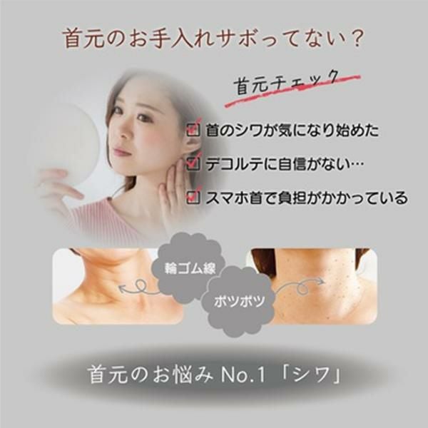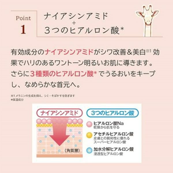 有効成分のナイアシンアミドが気になるシワを改善。さらに3つのヒアルロン酸でぽつぽつやざらつきもなめらかにケア。年齢の出やすい首元をワントーン明るい印象に!