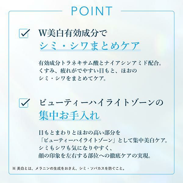 ●【目もと・ほお用】顔の印象を左右するビューティーハイライトゾーン*1を集中ケアすることで、明るい印象へ導くプラスワンアイテムです。(*1 目もとまわりとほおの高い部分を指す、顔の印象を左右する部位の総称)