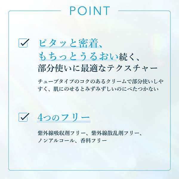 ●【しっとり密着・べたつかないテクスチャー】部分使いに便利なチューブタイプ。コクのあるクリームなのにみずみずしくべたつかず、しっとりとやわらかな肌にピタッと密着します。