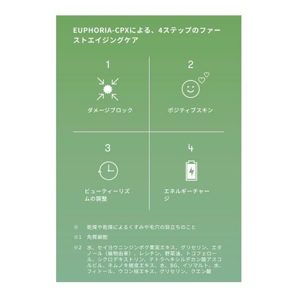 水、BG、スクワラン、グリセリン、トリ(カプリル酸/カプリン酸)グリセリル、ペンチレングリコール、セイヨウニンジンボク果実エキス、ネムノキ樹皮エキス、イソマルト、ウコン根エキス、ピタヤ果実エキス、サケ卵エキス、セイヨウハッカ葉エキス、タチジャコウソウ花/葉/茎エキス、チャ葉エキス、シクロデキストリン、テトラヘキシルデカン酸アスコルビル、フィトール、野菜油、(アクリル酸ヒドロキシエチル/アクリロイルジメチルタウリンNa)コポリマー、EDTA-2Na、アクリレーツクロスポリマー-2-Na、エタノール、カルボマー、ジメチコン、ステアリン酸グリセリル、ダイマージリノール酸(フィトステリル/イソステアリル/セチル/ステアリル/ベヘニル)、トコフェロール、トリポリヒドロキシステアリン酸ジペンタエリスリチル、ピロ亜硫酸Na、ホホバ種子油、ポリソルベート60、レシチン、水酸化K、水添レシチン、香料、エチルヘキシルグリセリン、フェノキシエタノール