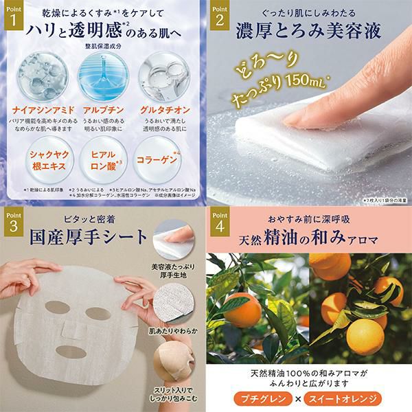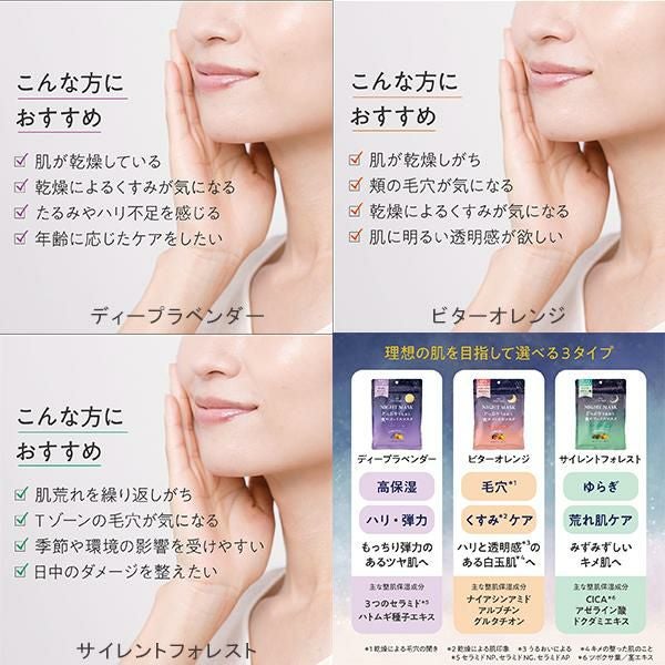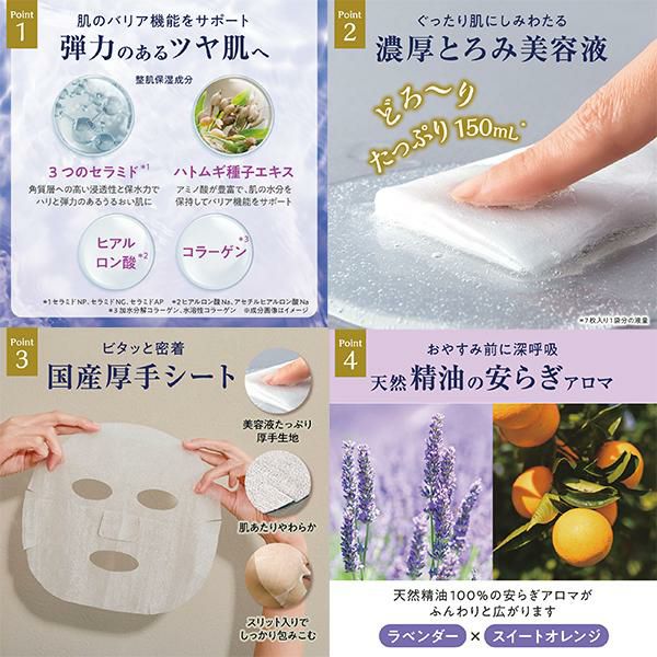 うるおいにどっぷり浸かる、濃厚とろみ美容液たっぷりのリッチな夜用フェイスマスク。肌あたりやわらかな厚手シートが肌に密着し、顔全体をしっかり包み込みます。理想の肌を目指して選べる3タイプ。1日の終わりのスペシャルナイトケアで心地よい明日へ。